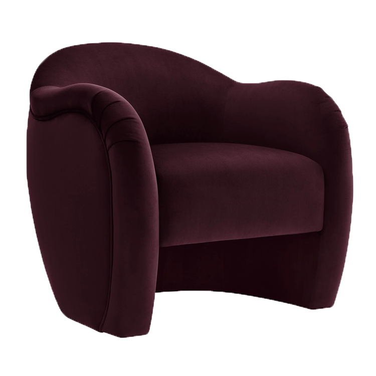 Plush mulberry velvet lounge chair with sculpted curves adds rich color and inviting comfort to refined event lounges and intimate seating areas.