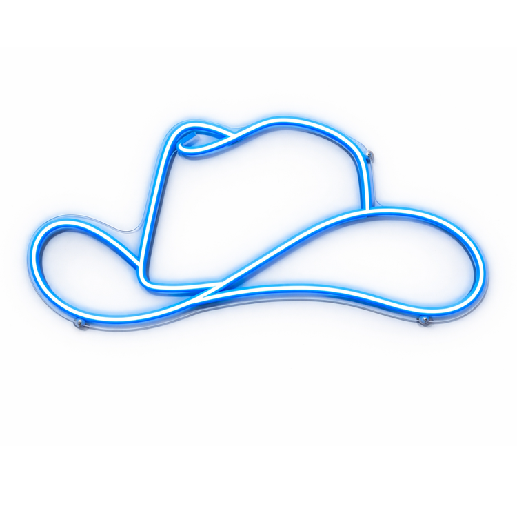 Bright blue cowboy hat neon sign elevates Western-themed events creating a bold focal point for photo moments, bars, and fun guest experiences.