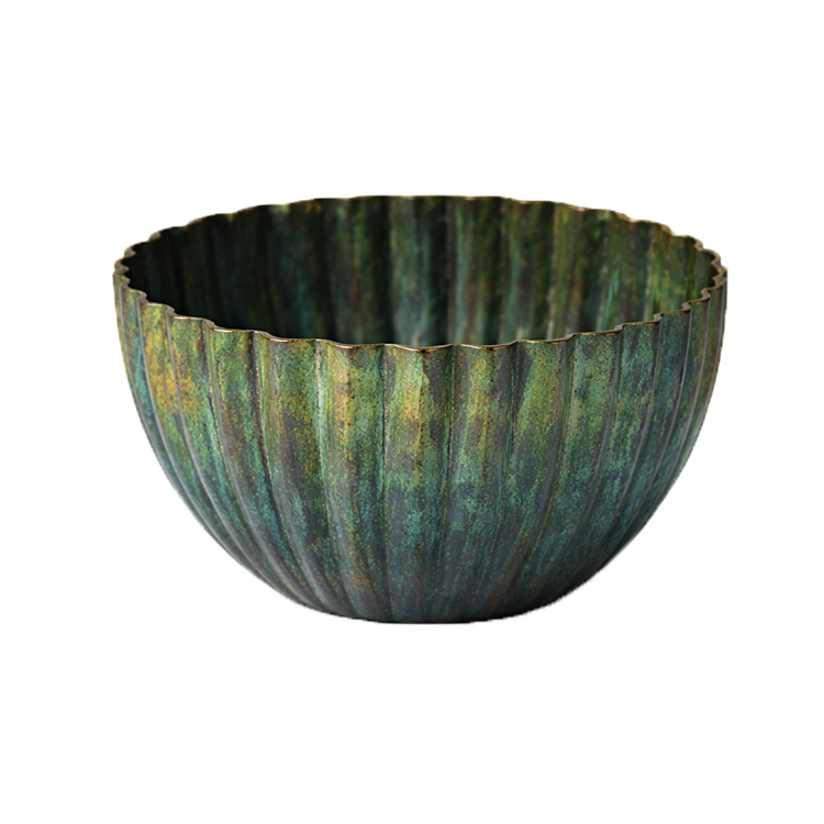This colorful, patinated metal bowl brings depth and movement, anchoring florals in moody, layered, or artfully styled event designs.