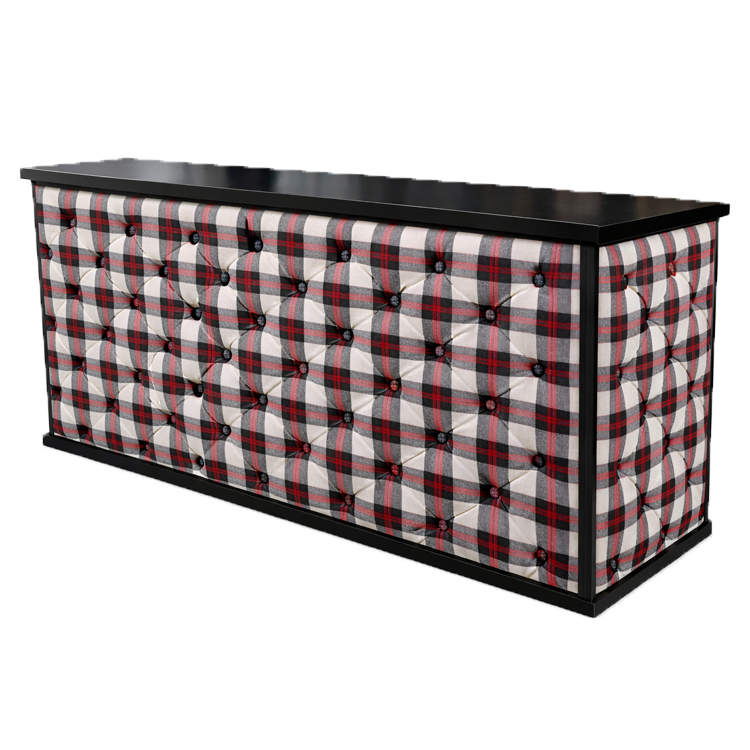 Set the perfect apres vibes with these beautiful biscuit-tufted bar in a classic red plaid pattern.