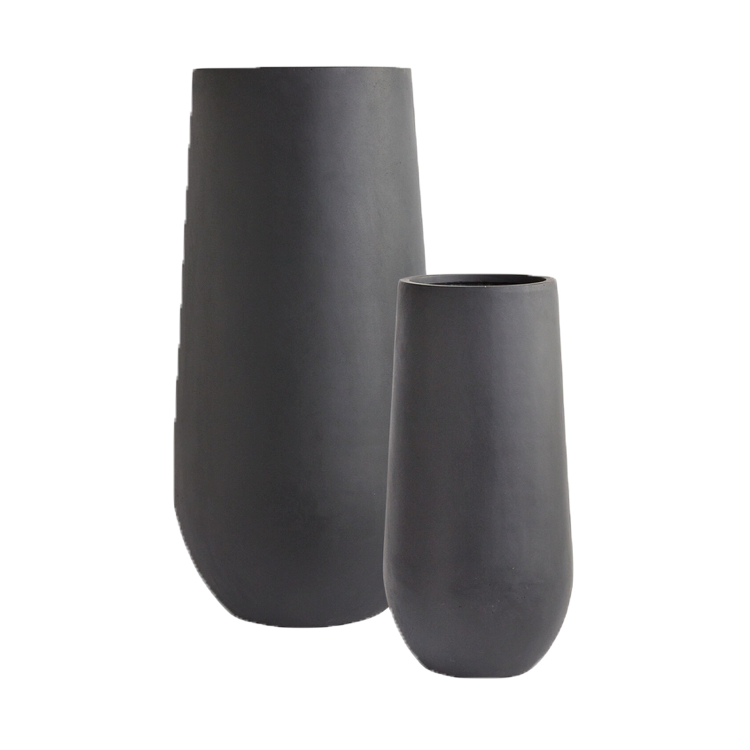 A sculptural matte-black vase with a minimalist silhouette anchors modern events, pairing beautifully with dramatic stems or architectural floral designs.