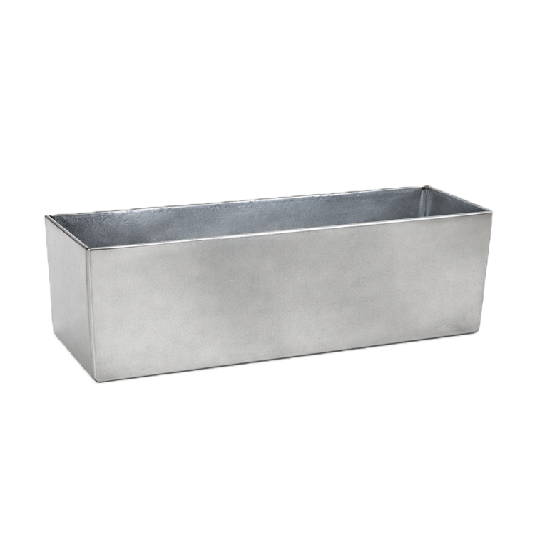 A sleek silver planter with clean lines is ideal for modern events, showcasing linear florals or lush greenery along communal tables and bars.