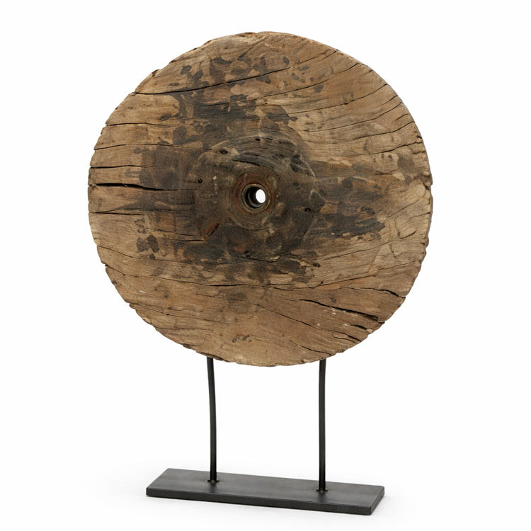 Large wood wheel sculpture offers bold rustic impact for Western, industrial, or heritage-inspired spaces.