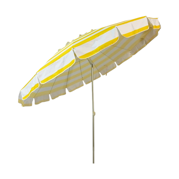 Whimsical orange and white umbrella can be tilted or stand straight up.